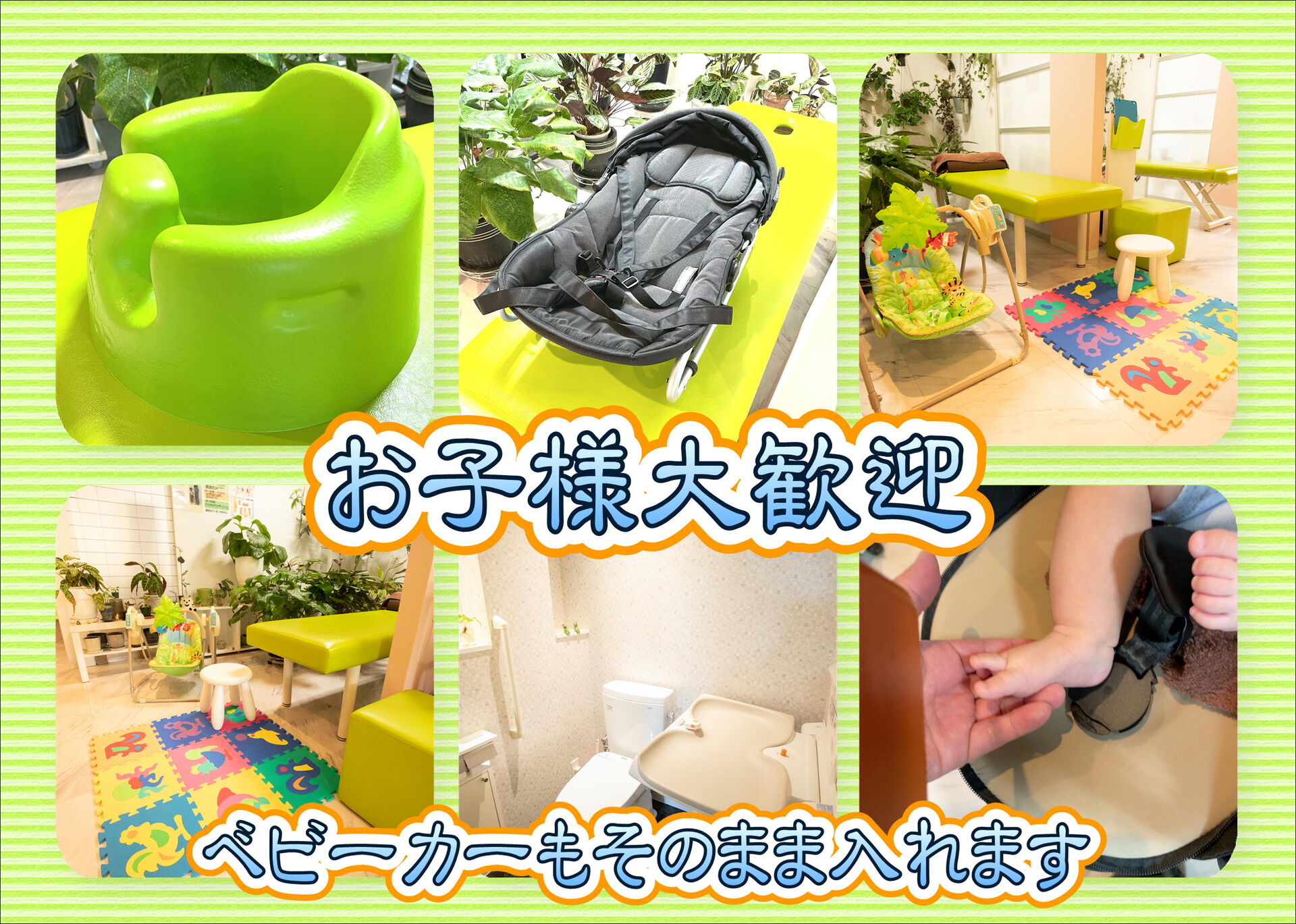 赤ちゃん、お子様大歓迎です!ベビーカーもそのまま入れますよ!赤ちゃん用ベッド&遊び用ブロックもあります